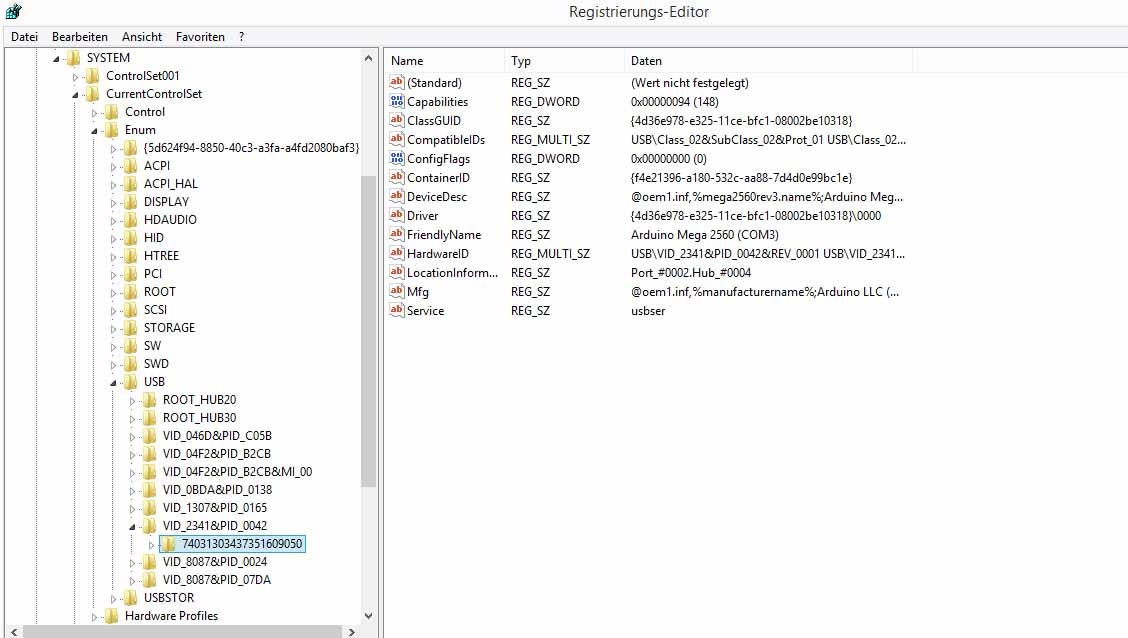 Schon in einem anderen Thread gelesen. Du benutzt die VID und PID Nummern, richtig? Da hat sich glaub ich nix geändert zwischen W7 und W8. (VID_2341&PID_0042). Oder benutzt du den Strng Namen? Seit nem Treiberupdate heists nicht mehr DESCRIPTION="Arduino Mega 2560 R3", sondern nur noch mega2560rev3.name="Arduino Mega 2560"